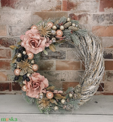 - Anyaga: vesszőkoszorú, selyemvirág, műfenyő, termések, üvegdíszek