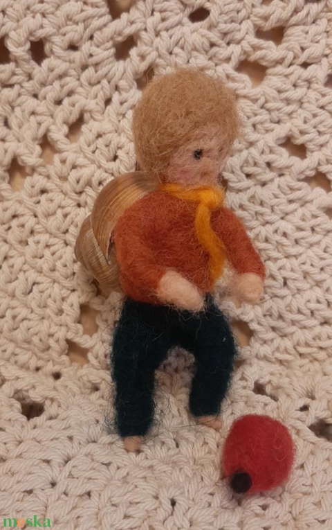 Tűnemez technikával készült kis csigamanó fiúcska az egy szem csipkebogyójával. A hátán csigaház.