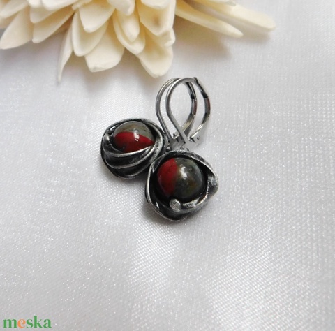 A fülbevaló tiffany technikával készült heliotróp gyöngyök, réz és ólommentes, ezüsttartalmú ón felhasználásával. A díszítés szintén saját készítésű, nem tartalmaz gyári elemeket. A díszítés szintén saját készítésű, nem tartalmaz gyári elemeket.A fémrészt óezüstre patináztam és lelakkoztam, hogy sokáig szép maradjon.