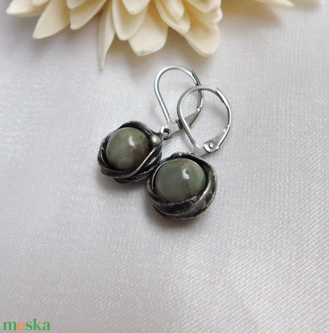 A fülbevaló tiffany technikával készült heliotróp gyöngyök, réz és ólommentes, ezüsttartalmú ón felhasználásával. A díszítés szintén saját készítésű, nem tartalmaz gyári elemeket. A díszítés szintén saját készítésű, nem tartalmaz gyári elemeket.A fémrészt óezüstre patináztam és lelakkoztam, hogy sokáig szép maradjon.