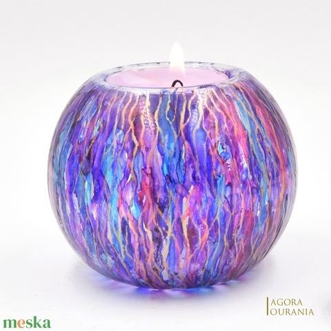 átlátszó üveg mécsestartó, arany üvegfesték, kék lila üvegfesték