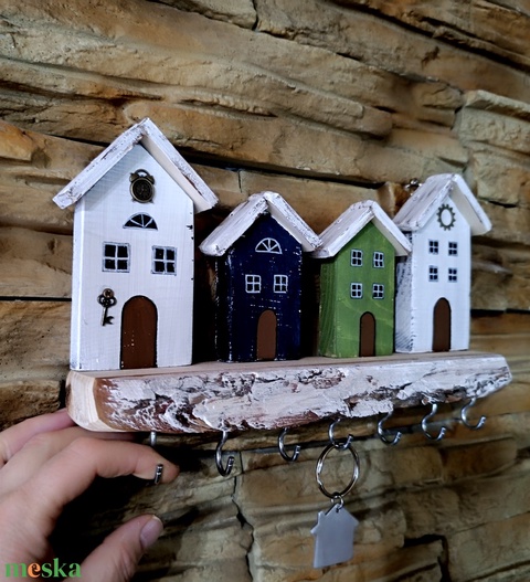 Színes, házikós fa fali kulcstartó