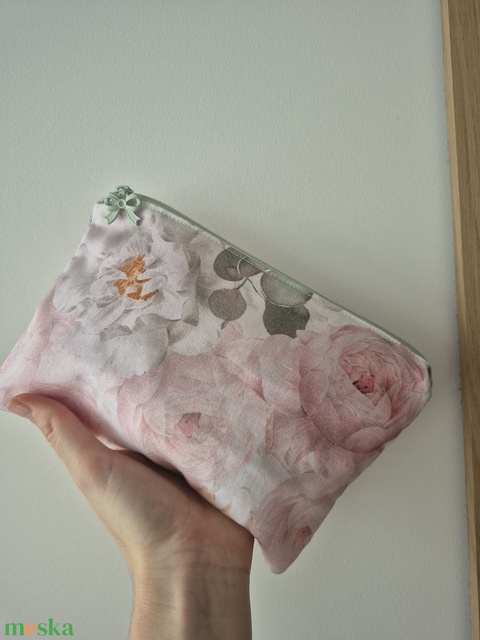 Rózsás pamut nesszeszer - zöld masnis cipzárral