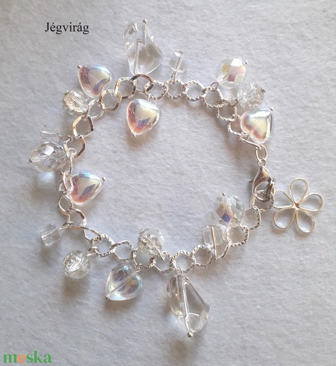 - Anyaga: ezüst színű karkötő alap, csiszolt gyöngy, préselt üveggyöngy, festett medálok, ezüst színű medálok