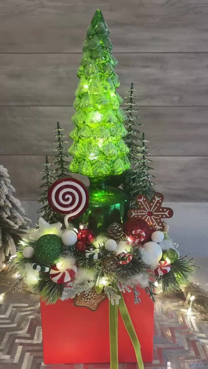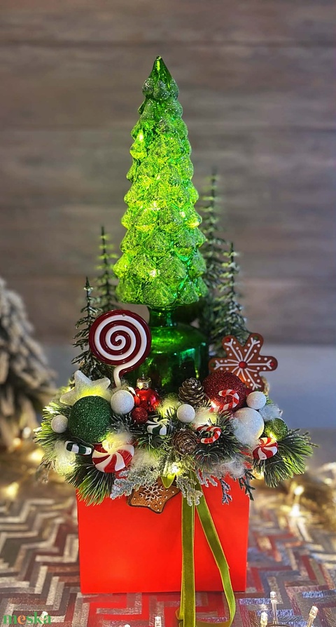 papír doboz, oázis, üveg ledes fenyő, díszek, led izzósor, bogyók, műfenyő, műanyag cukorka, nyalóka, mézeskalács