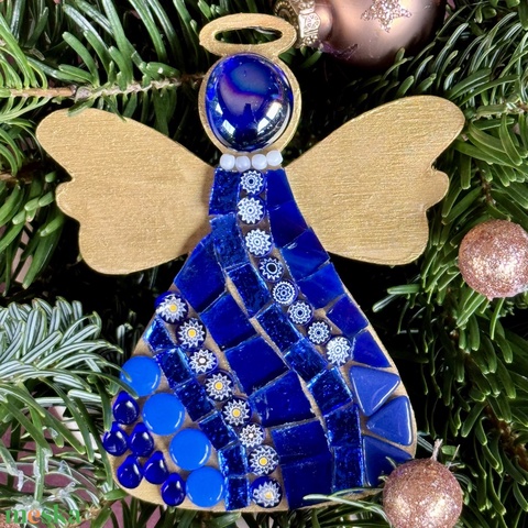 Arany-kék angyalka fa alapon. 10x8 cm