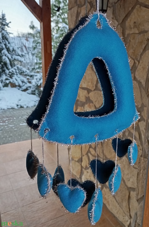 Téli filc harang ajtó- és ablakdísz – szíves, kézzel készült dekor (világoskék árnyalat, enyhén türkizes tónussal–ezüst)