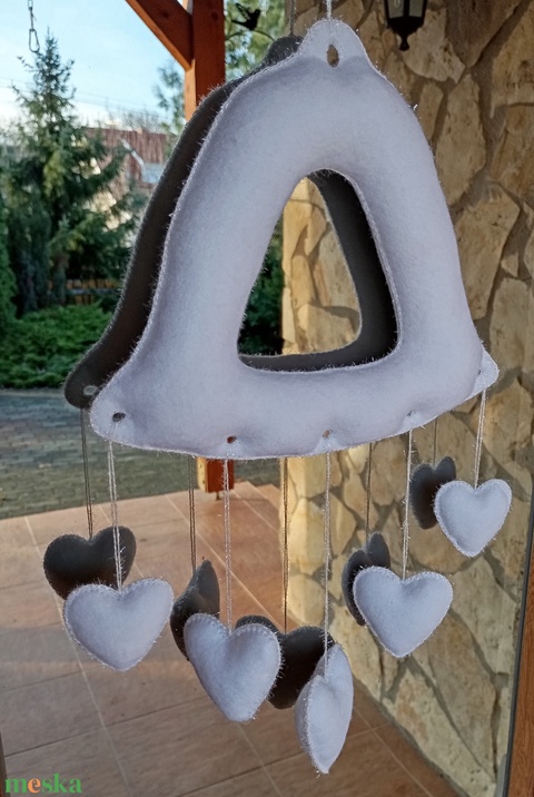 Téli filc harang ajtó- és ablakdísz – szíves, kézzel készült dekor (teljesen fehér)