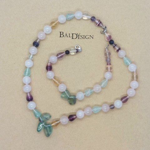 Szivárvány fluorit és rózsakvarc ékszerszett – Nyaklánc és karkötő Készüljél fel, hogy beragyogja a mindennapjaidat ez a lenyűgöző, kézzel készített ékszerszett, mely a Rózsakvarc lágy, pasztell árnyalatát ötvözi a színpompás Fluorit békés energiájával! Tökéletes választás a természetes ásványok kedvelőinek és azok számára, akik harmonikus kiegészítőre vágynak. A Termék jellemzői és stílusaTeljes ékszerszett: A szett tartalmaz egy elegáns nyakláncot és egy hozzáillő karkötőt, amelyek külön-külön és együtt is viselhetők.Természetes ásványok: Rózsakvarc (polírozott, kerek gyöngyök) és Szivárvány Fluorit (változatos, csepp alakú és faragott "pillangó" díszítőelemek).Színvilág: Pasztell rózsaszín, halványzöld, mentazöld, lila, sárga és tiszta kristályárnyalatok harmonikus keveréke.Különleges díszítés: A nyaklánc és a karkötő központi elemei egy-egy szabálytalan alakú, pillangóra emlékeztető Fluorit darab, amely egyedi, finom megjelenést kölcsönöz az ékszernek.Rögzítés: Biztonságos, ezüst delfinkapocs  biztosítja a könnyű fel- és levételt.Stílus: Finom, nőies, természetközeli és feltűnő. Ideális ajándék bármilyen alkalomra!Az ásványok ereje és jelentéseA kristálygyógyászat és az ásványtan szerint mindkét kő különleges energiával rendelkezik:Rózsakvarc: A feltétel nélküli szeretet és a béke köve. Segíti az érzelmi gyógyulást, vonzza a szerelmet, és támogatja az önszeretetet. Nyugtató hatású, oldja a szorongást.Fluorit: Egyensúlyt teremtő, rendszerező kő. Segíti a koncentrációt, növeli az intuitív képességeket, és stabilizálja az aurát. Különösen ajánlott a stresszes időszakokban.SEO Kulcsszavak: Fluorit nyaklánc, Rózsakvarc karkötő, ásvány ékszerszett, kézzel készült ajándék nőknek, természetes kő ékszer, szeretet karkötő, rózsakvarc szett.Ne hagyjad ki ezt az egyedi, energiával teli ékszerkollekciót! Rendeld meg most, hogy megtapasztald  a Rózsakvarc és a Fluorit harmóniáját a saját bőrödön!A nyaklánc hossza: 45cm, a karkötő hossza: 20cm