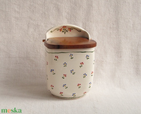 Kerámia sótartó, cukortartó fa fedéllel, virágos díszítéssel