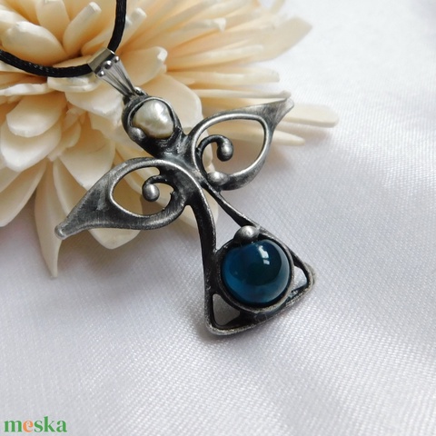 achát , rézdrót, ólommentes ón, felületkezelő anyagok, szaténzsinór, folyami gyöngy