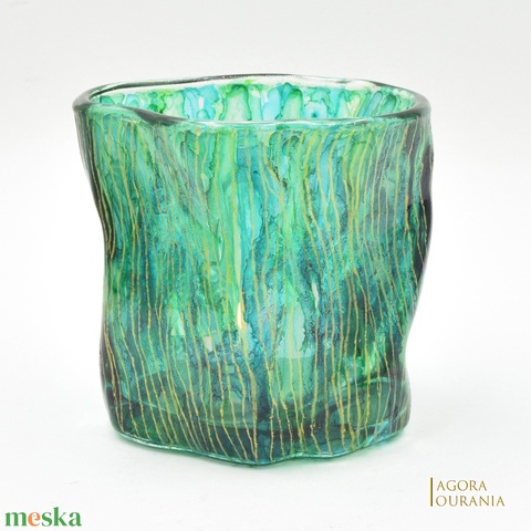 átlátszó üveg mécsestartó, arany üvegfesték, zöld türkiz üvegfesték