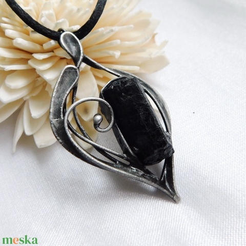 A medál Tiffany technikával készült turmalin, réz és ólommentes, ezüsttartalmú ón felhasználásával. A díszítés szintén saját készítésű, nem tartalmaz gyári elemeket. A fémrészt óezüstre patináztam és lelakkoztam, hogy sokáig szép maradjon.