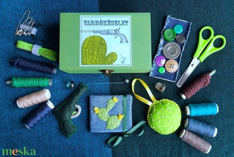 'Vadnyugati Cowboy Kaland' varrókészlet, kék-zöld-barna varródoboz, kreatív szett fadobozban, kaktusz, western
