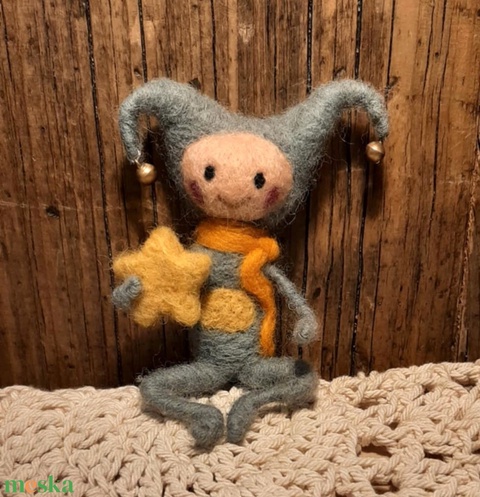 Tűnemez technikával készült manó. Sipkáján csengők csilingelnek, kezében csillagot tart.