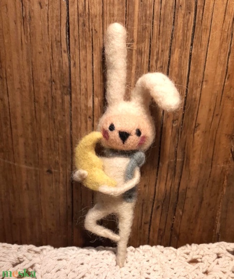 Tűnemez technikával készült sálas nyuszi, aki a holdat tartja a kezében.
