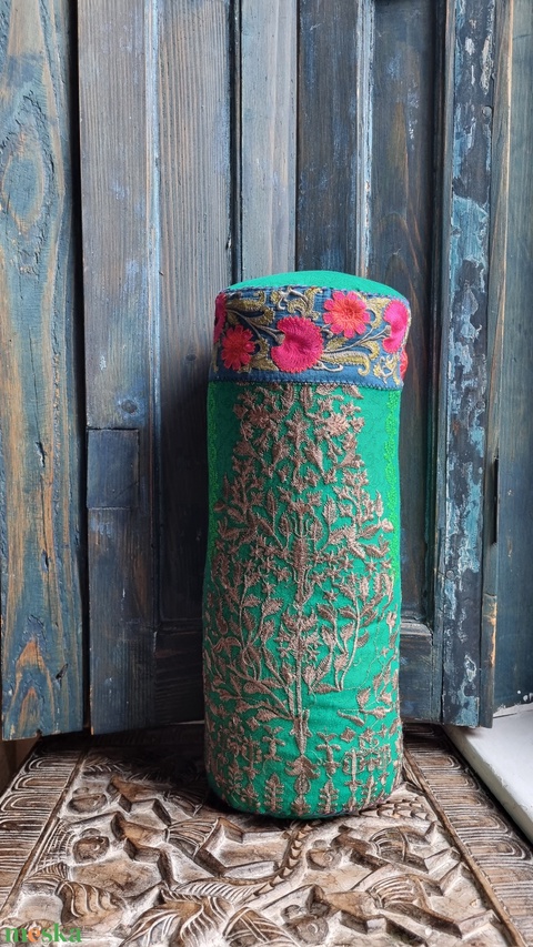 Eső után-Hímzett hengerpárna zöld/bézs/magenta