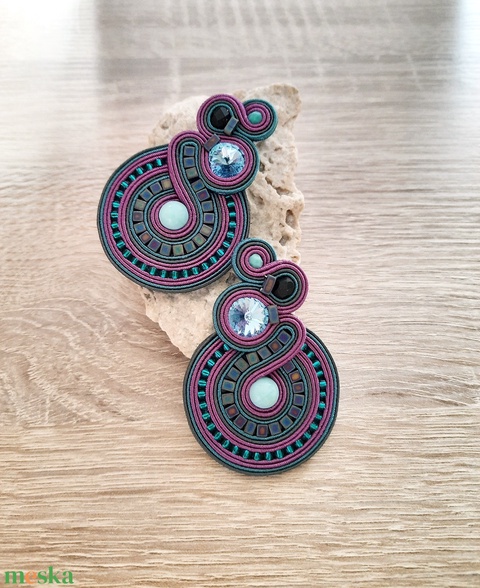 - Anyaga: sújtás zsinór, swarovszki kristály, japán kása, cseh csiszolt gyöngy, ragasztó, cérna, nikkel mentes fémszerelék, cseh kaboson