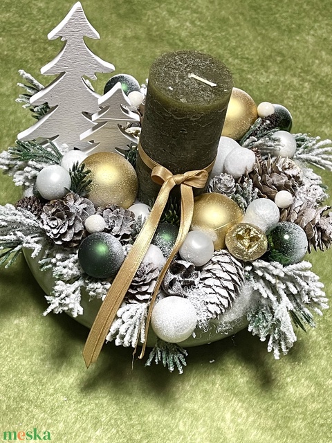 Karácsonyi asztaldísz, kerámia tál-kaspóban, elegáns zöld-arany-fehér díszítéssel