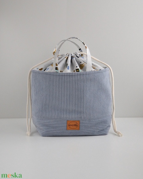 Nagy méretű behúzós projekt táska kézimunkához (világoskék téli házas kordbársony)