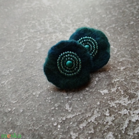 Türkiz gyapjú korong gyönggyel hímezve óriás pötty fülbevaló