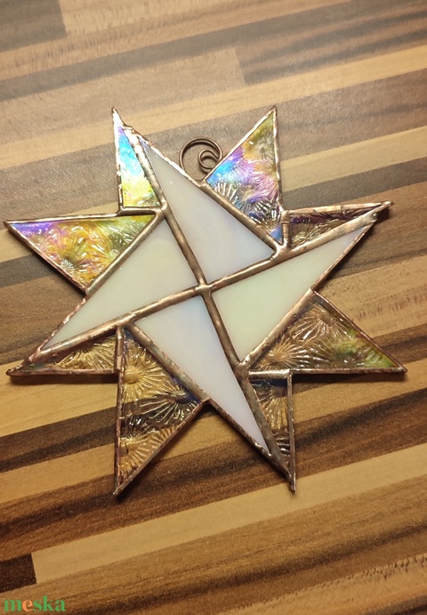 - Anyaga: irizáló üveg, rézfólia, patina, rézdrót, ón, üvegkavics