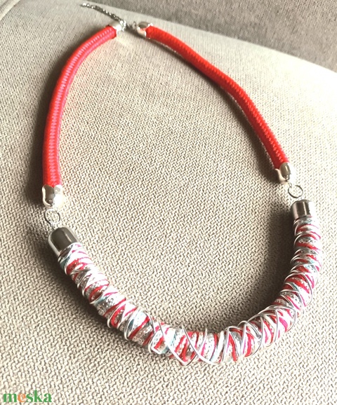 Piros, ezüst, zöld fonal, piros zsinór nyaklánc