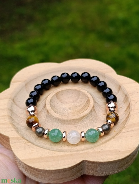Bőségtudat női ásványkarkötő aventurinnal, tigrisszemmel, pirittel, hematittal és ónixszal