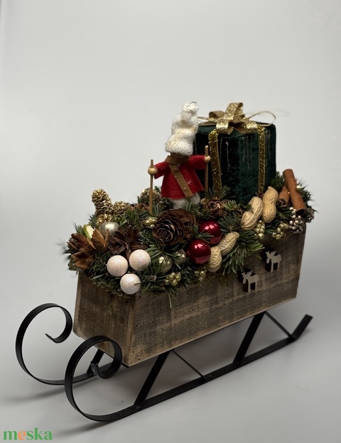 Ajándék fogat - fémtalpas faszán ünnepi asztaldísz termésekkel és kellékekkel gazdagon díszítve