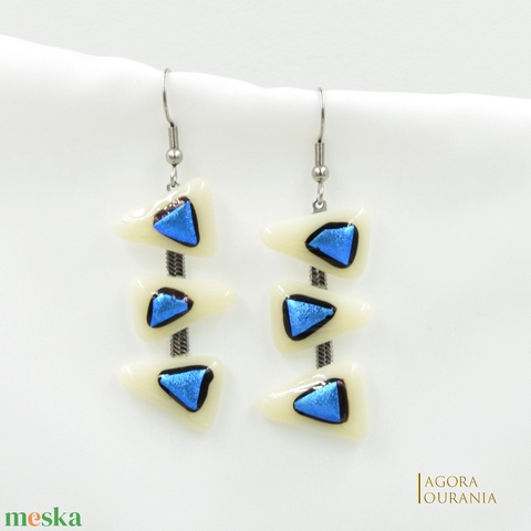 - Anyaga: nemes acél fülbevaló akasztó, nemes acél szerelék, törtfehér üveg, kék irizáló dichroic ékszerüveg