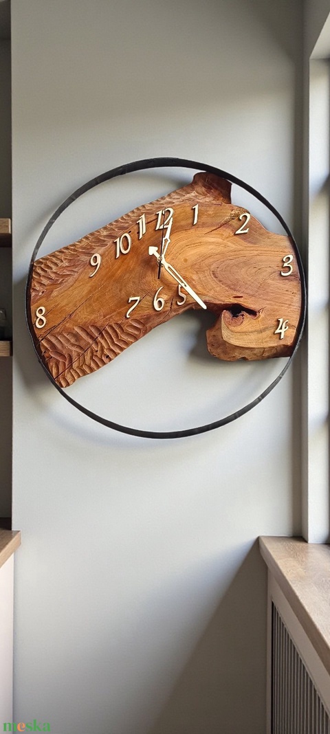 Falióra régi hordóabroncsban – mandulafával, fa számokkal és mutatókkal 43cm