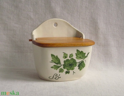 Kerámia sótartó, fa fedéllel, zöld virágos díszítéssel