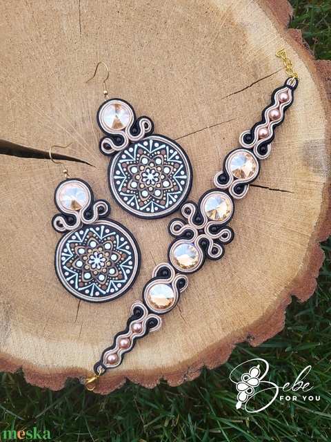 Tündérvirág bézs-fekete kézzel festett mandalás kézműves sujtás fülbevaló és karkötő szett