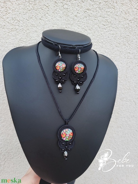 Fekete matyó mintás, magyaros kézműves sujtás fülbevaló és nyaklánc szett