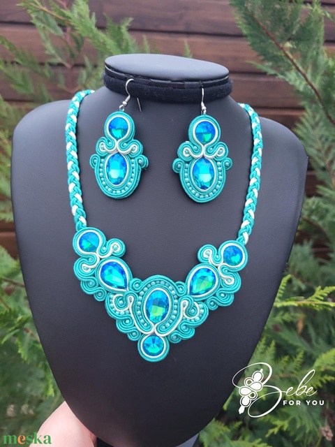 Türkiz tündérkorona gyöngyözött kézműves sujtás fülbevaló és nyakék szett
