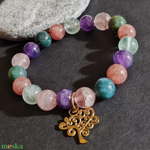- Anyaga: gumiszál, arany nemesacél medál, ametiszt, eperkvarc, hematitos kvarc, fluorit, moha achát