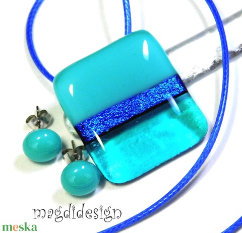 Türkiz-kék színtrió üvegékszer szett nyaklánc stiftes fülbevaló