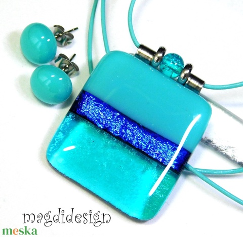 Türkiz-kék színtrió üvegékszer szett nyaklánc stiftes fülbevaló 3