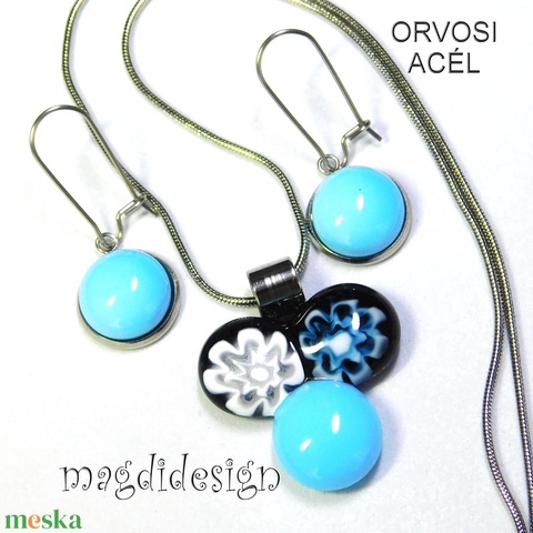 Fekete-kék bogyós színtrió üvegékszer szett nyaklánc lógós fülbevaló