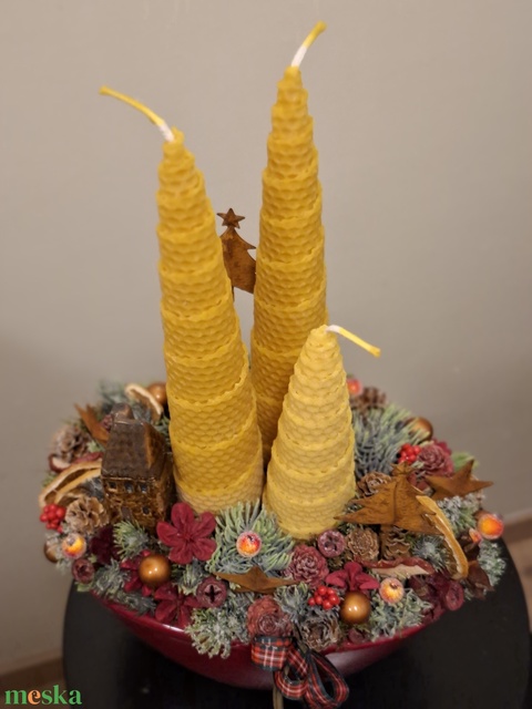 - Anyaga: kerámia, méhviasz gyertya, termések, narancskarikák, almakarikák