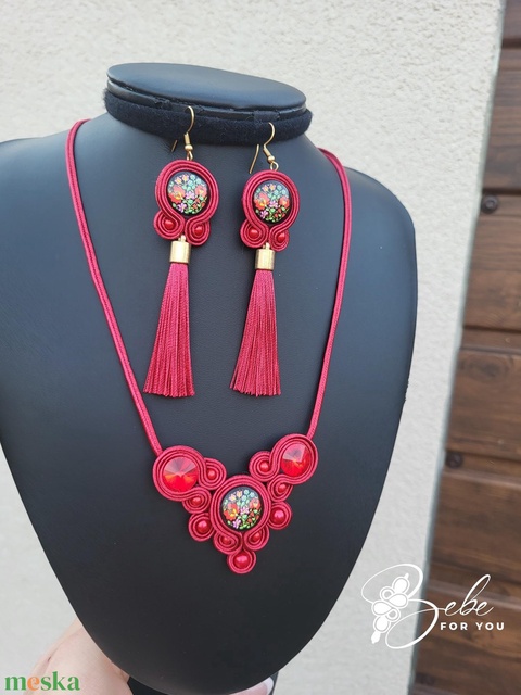 Matyó mintás, magyaros, bordó bojtos, kézműves sujtás fülbevaló és nyaklánc szett