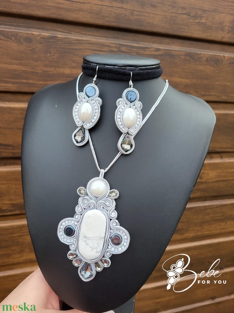 Fehér türkiz, ásványköves és porcelán lencsés kézműves sujtás ékszerszett