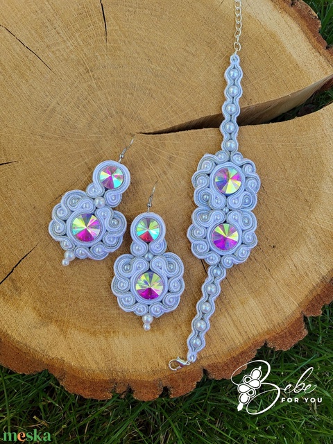 Habcsók hófehér-ezüst kézműves sujtás ékszerszett fülbevaló és karkötő