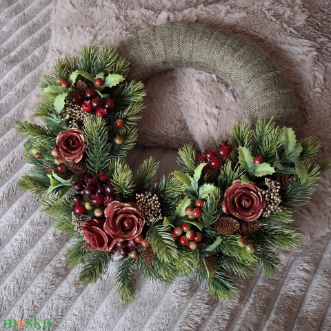 - Anyaga: szalma koszorú, műzöld, selyemvirág, hungarocell bogyók