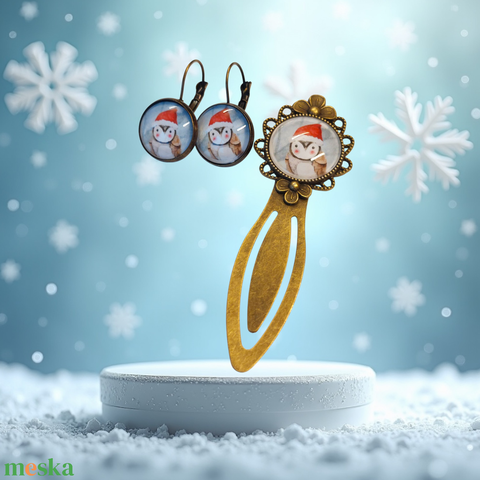 Karácsonyi pingvin üveglencsés könyvjelző és fülbevaló szett – azonnal készletről!