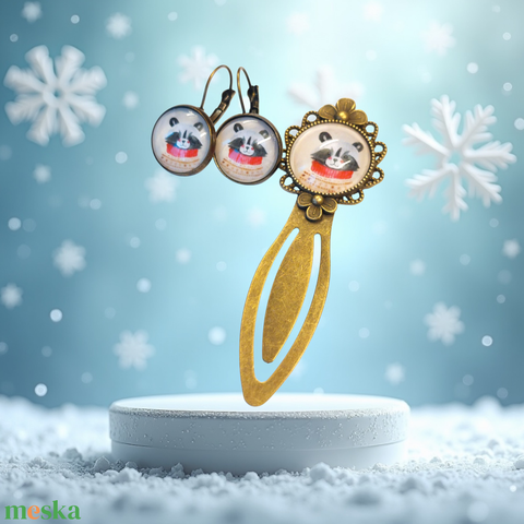 Karácsonyi mosómedve piros sállal üveglencsés könyvjelző és fülbevaló szett – azonnal készletről!