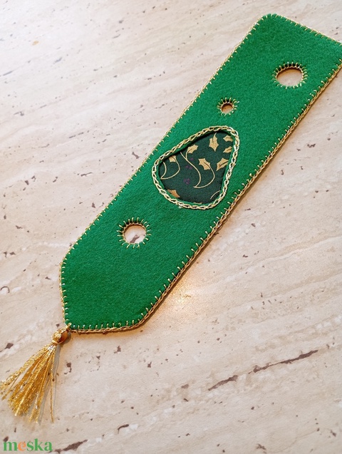 Karácsonyi filc harang könyvjelző – zöld, arany horgolással