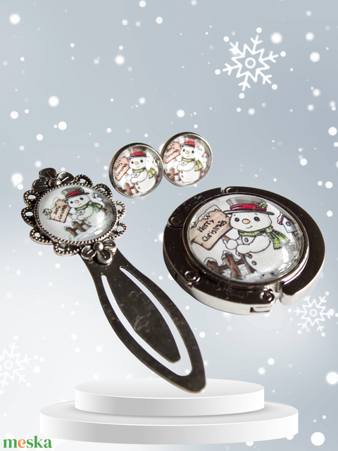 Karácsonyi hóemberes üveglencsés könyvjelző és fülbevaló szett táskatartóval