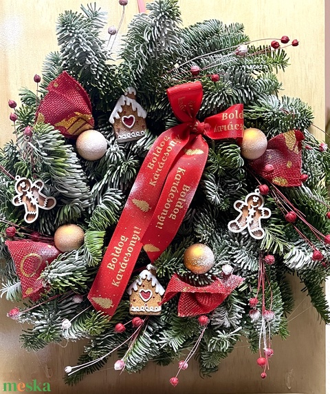 Karácsonyi ajtódísz Nobilis élőfenyőből, mézi figurákkal, vidám, mégis ünnepi díszítéssel