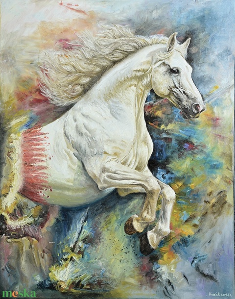 Konstantin Pál: fehér ló modern nagyméretű olajfestmény vásznon, oldalt festve
